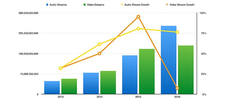 The report’s toppest-line conclusion is that the music industry “experienced steady and consistent growth” this past year with a 3.1% increase in “volume” over 2015, fueled mostly by a 76% increase in digital, on-demand audio streams – though in reality it’s a 39.2% when you take into account “video” streams, i.e. Youtube. Now, the word “volume” is a fun term the industry has created over the past few years to somehow quantify digital streaming through platforms like Spotify, Apple Music, Google Music, Tidal, Pandora, Youtube, etc. and combine it with the traditional metric of “sales,” which accounts for units of songs and albums purchased either physically or digitally.