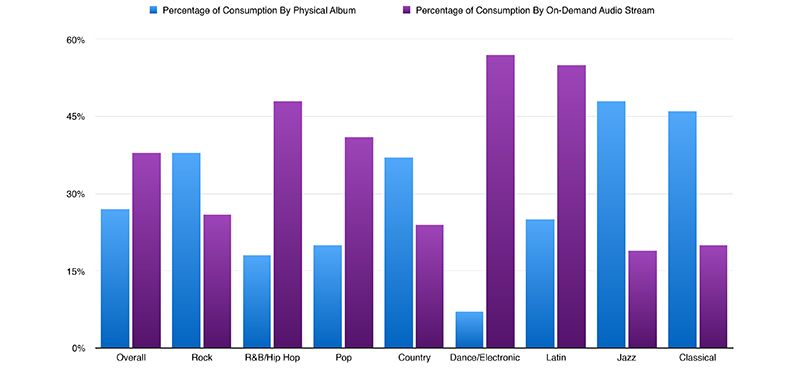 For my money though, the most interesting numbers from the report come from the breakdown of share of “volume” by genre and format. Given that the digital streaming revolution is being led in large part by the younger generations, it logically follows that the musical genres that see the highest share of consumption through on-demand streaming are the areas that are seeing the biggest growth. Also logically, the opposite can be said about the genres that have the lowest share of on-demand streaming and highest shares of physical sales. And here there is an exceedingly clear divide that has formed, one that spells doom for anyone still holding out hope for rock to be “saved” and remain wholly relevant.