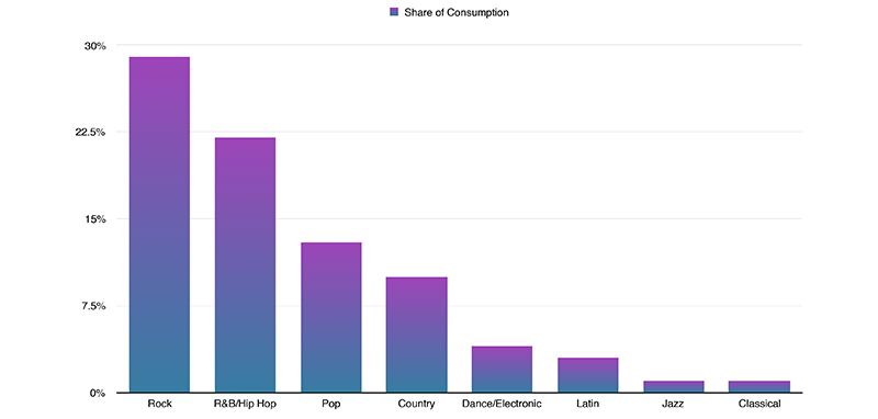 As you can see above, rock still represented the largest share of music consumed by genre in 2016, followed most closely by R&B/hip hop, and then trailed by pop, country, electronic, Latin, jazz, and classical (I did not include Christian/gospel, holiday/seasonal, and children’s music). There’s nothing particularly surprising or illuminating from these figures (though I admit I thought electronic would represent a larger share than it does). Keep these numbers in mind though as you look at the below chart.
