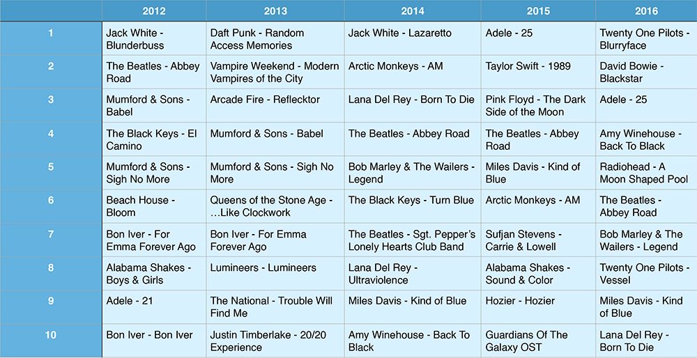 Which brings me to my second point on vinyls, which is where the most sales are coming from. If you’re looking for signs of a healthy market for something like vinyls, you want the highest-selling items to come primarily from new releases and artists and not from “legacy” items – either classic albums or more current albums that have had lasting impact for various reasons. I went ahead and tracked down the top 10 best-selling vinyls in the US over the past 5 years, and while there might not be anything too surprising from the results, there is definitely a worrisome trend present.