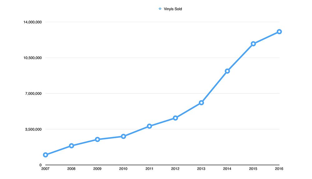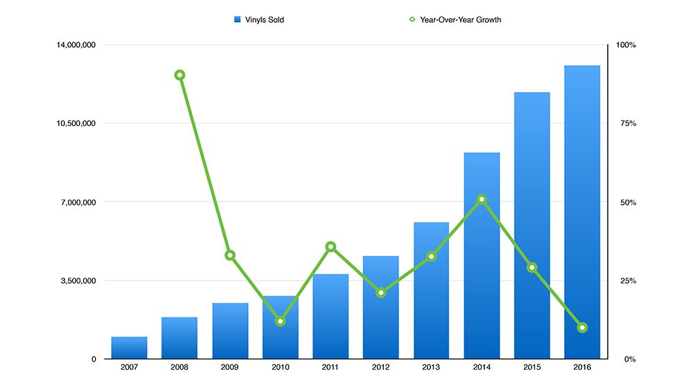 Excluding 2007-2008, which saw a ridiculous year-over-year spike due to a low starting point and relative explosion after, you can see the trend line mostly going up until 2014, at which point there is a very obvious and steep decline. 2016 represented the worst year-over-year growth since the “revival” began, and if you’re an industry expert, vinyl manufacturer, or vinyl distributor/merchant, you are probably looking at those numbers and wondering if this means sales are simply going to level out and hold relatively constant over the next few years, or if there’s a major crash coming.