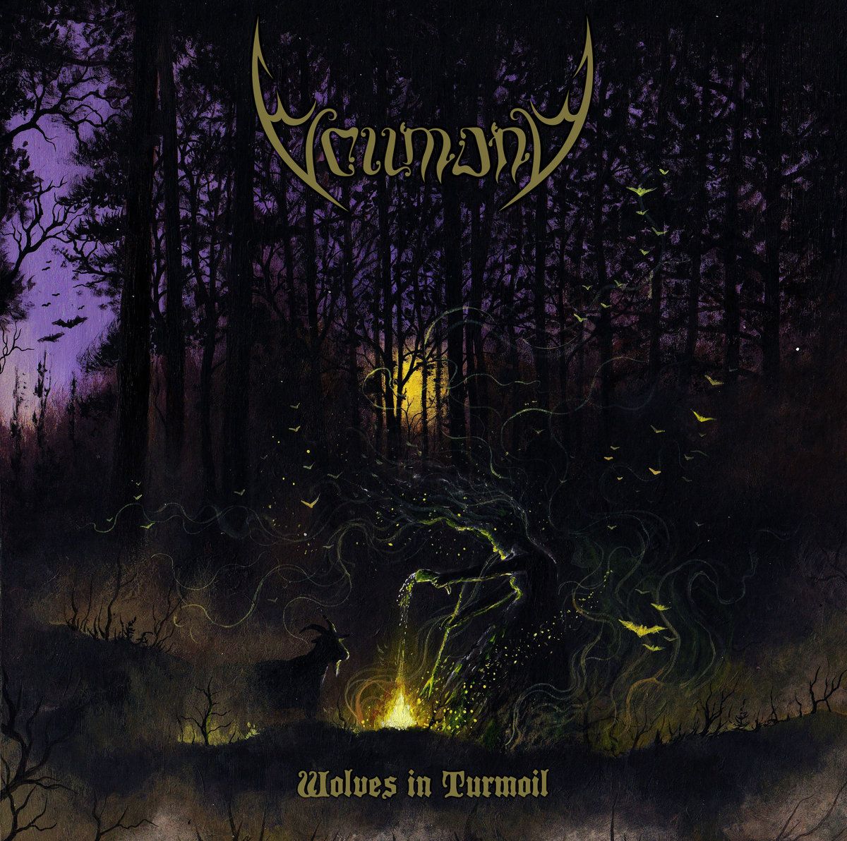 Among violet skies and somber woods is a protagonist evaporating into energy as a goat looks on and bats fly from the scene. Nedelea’s cover palette is apt for the atmospheric elements of the composition embodied within, giving listeners a tantalizing scene to look at while Vollmond’s black riffs wash you over. Vollmond translates to ‘full moon’, so it only makes sense that their third incarnation embraces the coming of said occurrence, and we all know what happens during a full moon. From the setting sun to the foliage amidst the forest trees, Nedelea packed an abundance of detail into the cover, completing the audiovisual experience of Wolves In Turmoil. Vollmond themselves centered their black and white promo photographs for the release cycle as masked beings among a forest, ready to commence a ritual. As a band with lyricism channelling darkness and paganism, partnering with Nedelea’s occult talents was a match made in heaven, or hell for this matter. As an archaeologist with a Ph.D. in Ancient History, Nedelea’s influences and experience are plentiful, which is visible in her art.