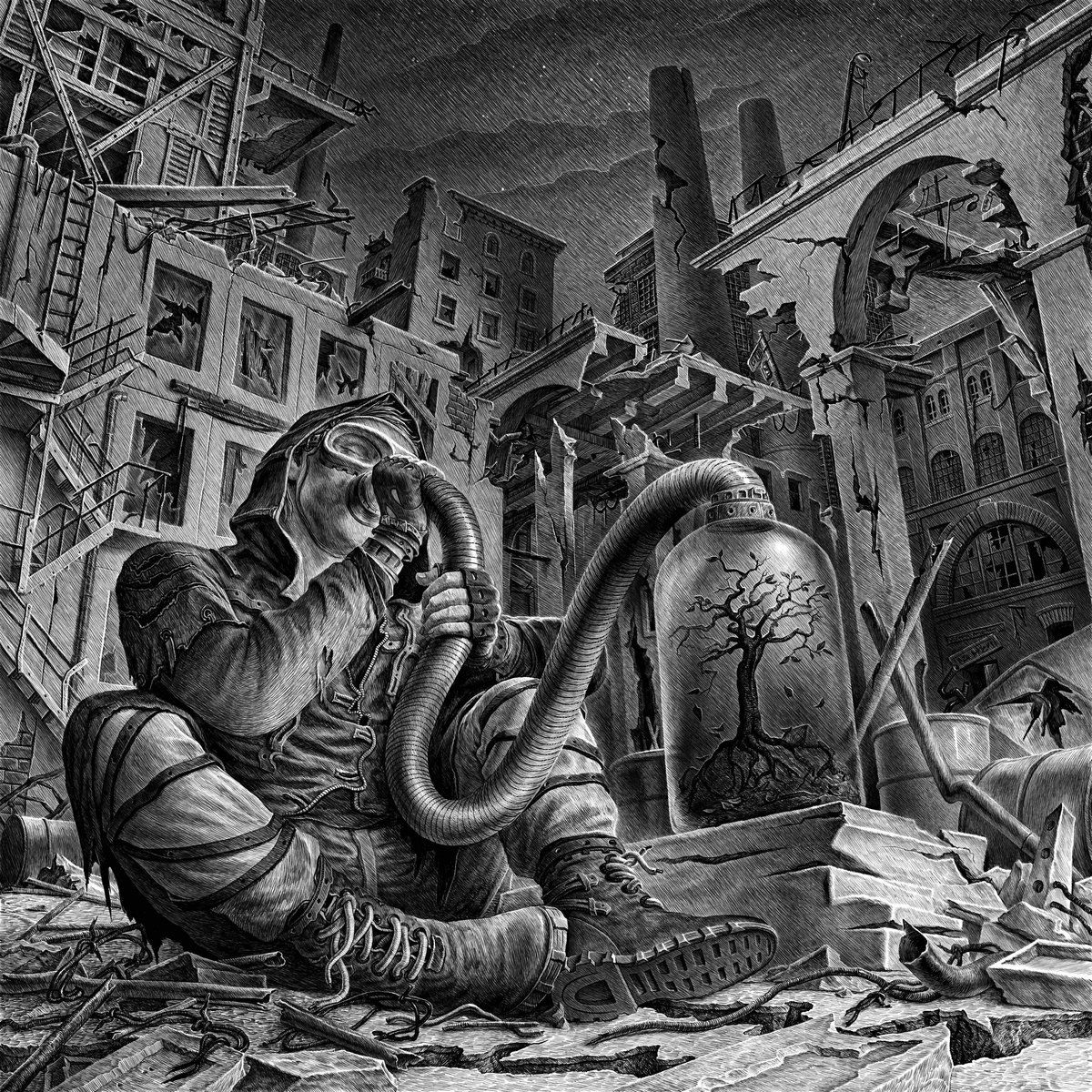 Sure enough, Geketend in de schaduw van het leven was among our Top 30 Album Covers of 2020 for its ability to convey such striking messaging through a monotone color palette. Said color palette is present throughout Kurkhuli’s sci-fi and horror book illustrations, and it’s truly representative of the emotion that Meslamtaea delivers. Like its predecessor, Geketend employs much in the realm of symbolism and foreshadows a disparaging world where industrialism, deforestation, and capitalism as a whole are slowly contributing towards desolation. You’ll find the cover’s protagonist sitting among a destroyed set of buildings, breathing clean air from a tube connected to a slowly withering tree. Seeing as the tree is encapsulated, it questions whether trees themselves are a scarce resource in Kurkhuli’s theoretical world and poses large concerns over the air quality of the surrounding environment. Judging by facial expressions alone, the protagonist here is holding on to dear life and embracing every bit of oxygen from the tube, a moving scene as we witness a crumbling factory in the background.