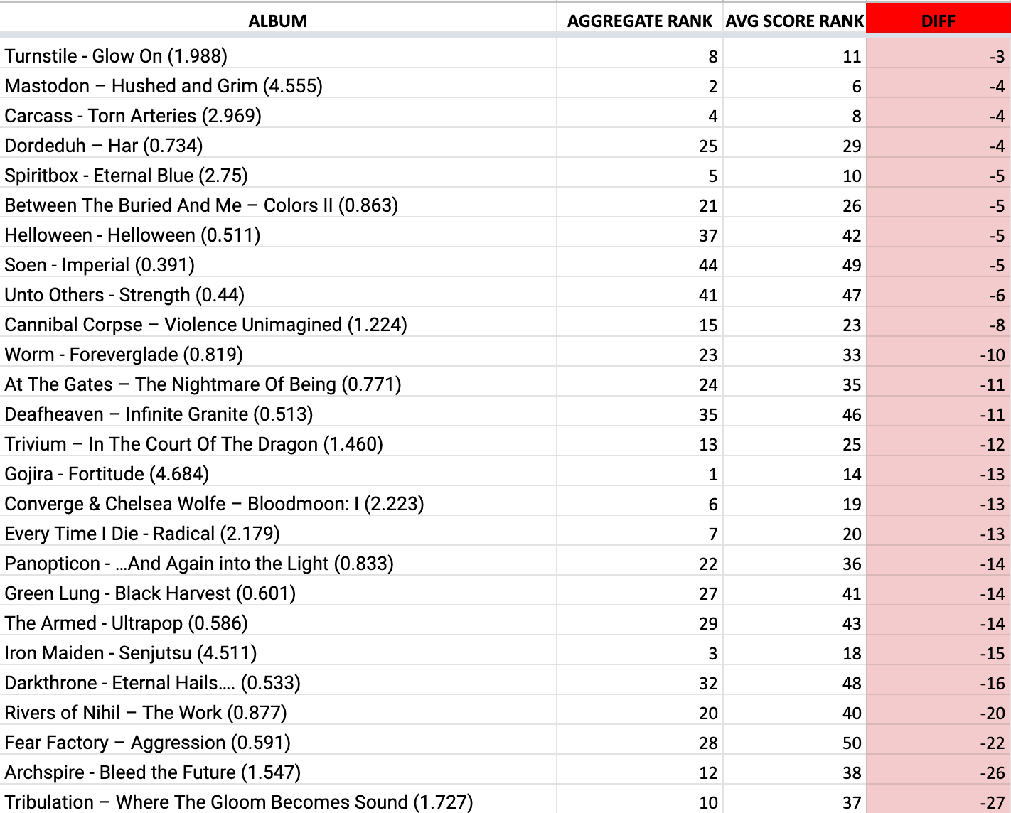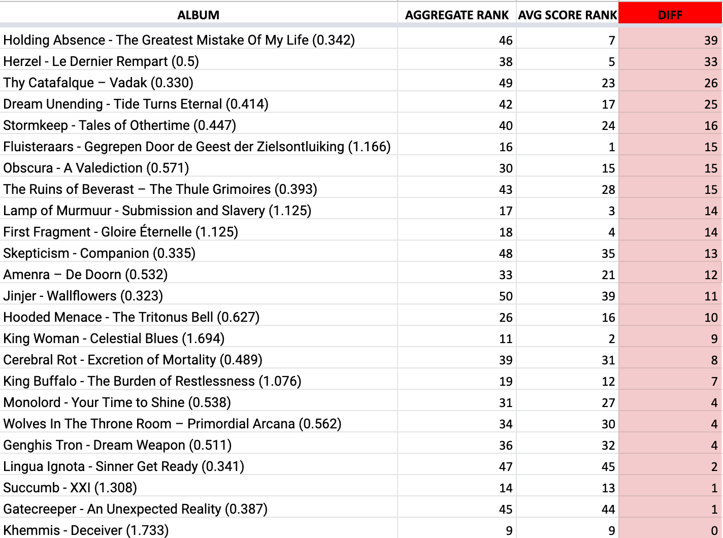 To determine this, I compared their rank on the aggregate list to their rank in average score/placement. If the difference between the two ran deep into the negatives (high aggregate rank, low average score rank), this is an indication that the album received a lot of votes but largely lower-scoring ones. And if it was the inverse and produced a high positive score, that indicates that the album likely didn’t receive that many votes overall, but those votes were all quite high.”