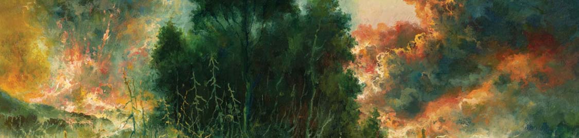 In actuality, these more extended passages are what makes the album work so well, creating the musical “legend” from which the rest of the album draws. They become building blocks, not only recurring on their own right but also repeating throughout the heavier segments in little nods and touches that the band expertly weave into their riffs. “Celestial” is probably the best result of this on the album; the opening segments of the album pop up again in several key places but mostly in the “backing” guitar riffs. These are like the foundational colors of the album’s cover art, the greens and blues of it. Not as dramatic as the oranges, yellows, and deep greens of the fire and the tree, these colors (and by association, the underlying riffs of the music) are what gives the full piece its presence and staying power.